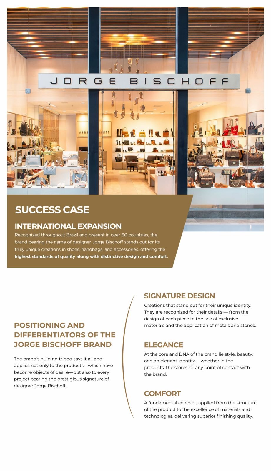 JORGE BISCHOFF is a brand of well-targeted strategies, applied on all business platforms. The flagship is the women’s collection. In its portfolio, shoes, bags and accessories aimed at an audience that values elegance, comfort and differentiated design standards. The exuberance of the Brazilian woman inspires the creations, guided by the macrotrends of international fashion. The original DNA of the brand is shown in the colors, prints and the use of exclusive metals and ornaments.